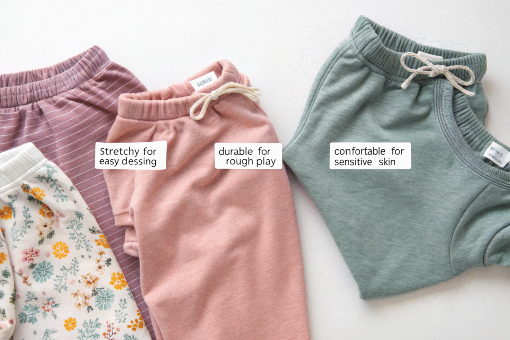 The ideal toddler fabrics combine stretch for easy dressing, durability for active play, and comfort for sensitive skin. Fabrics should have enough mechanical stretch to pull over heads and limbs easily yet maintain their shape through rough play and frequent washing. Additionally, fabric weight and texture affect how clothing feels during movement and whether it causes sensory issues for particular children.
