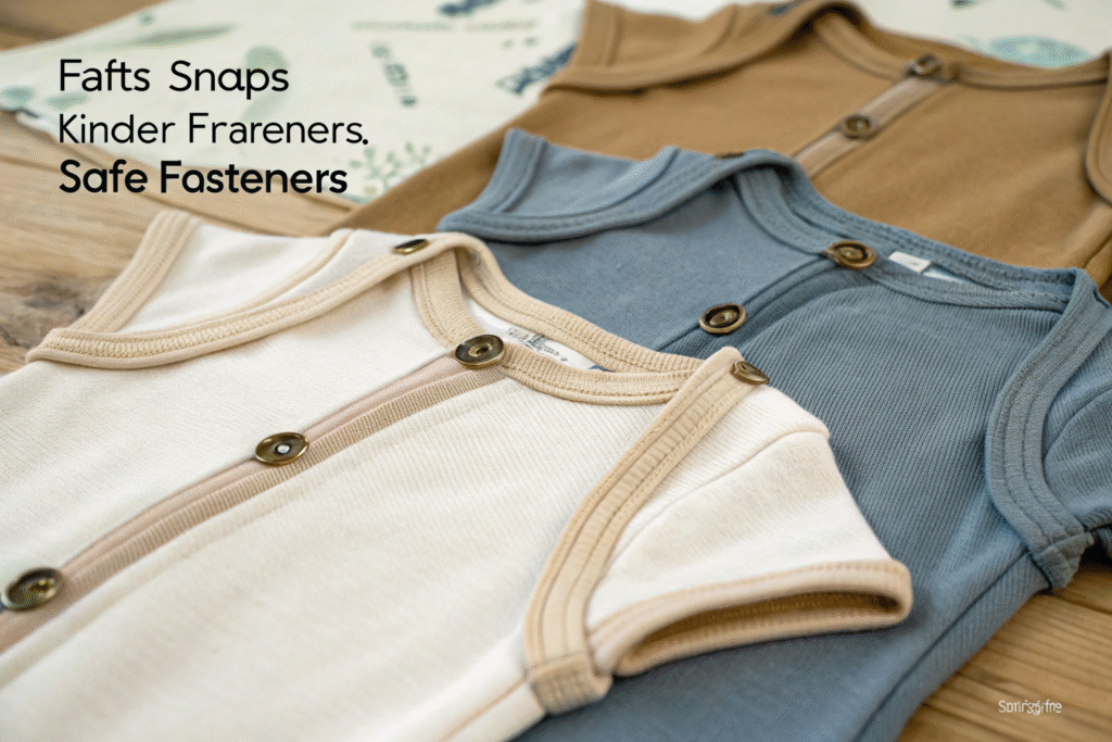 Flat snaps, covered zippers, and heat-sealed labels are considered the safest. Standards like ASTM F1816 regulate small parts to reduce strangulation or choking risks.