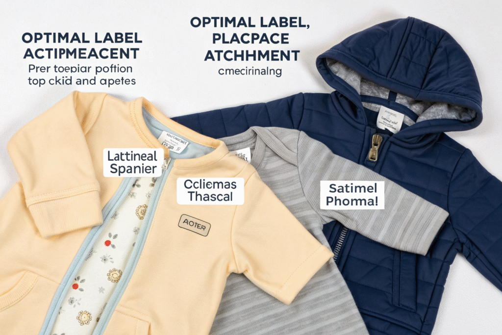 Label placement and attachment require special consideration in children's clothing due to comfort and safety concerns. Labels must be securely attached to withstand rigorous use while positioned to avoid irritating children's sensitive skin.