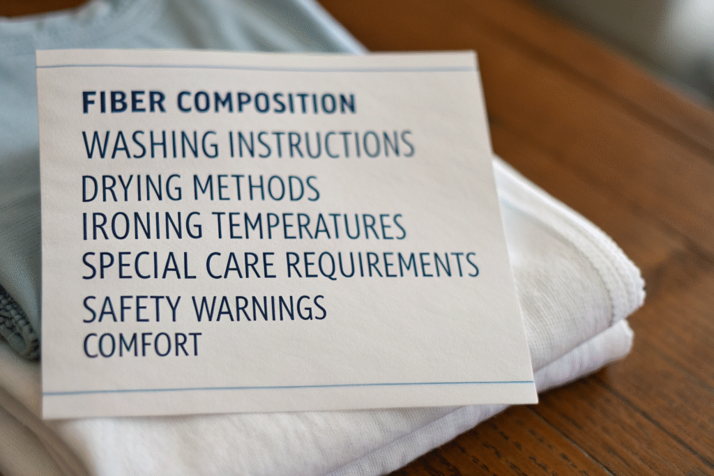 Essential content includes fiber composition, washing instructions, drying methods, ironing temperatures, and any special care requirements. For children's clothing, additional considerations like safety warnings and comfort-related information become particularly important.