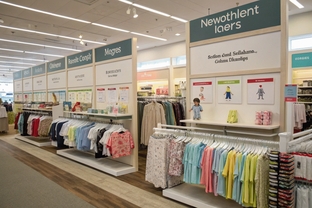 Newborn (0-12 months), toddler (1-3 years), young child (4-7 years), and older child/tween (8-12+ years) represent the most practical divisions. Each section should feature appropriate fixture heights, accessible product placement, and relevant adjacencies (like newborn clothing near feeding accessories). According to Retail Navigation Research, stores with clear age zoning achieve 25-40% faster customer navigation to target products.