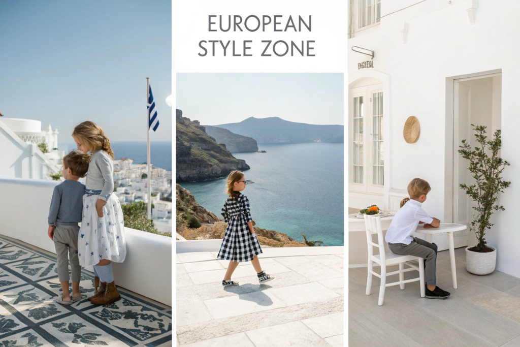 Southern Europe (Italy, Spain, France, Portugal, Greece): Here, the aesthetic leans towards elegant expressionism. There is a greater embrace of color, pattern, and decorative details. Fit is often more tailored, even for children. You'll see more traditional "dress-up" pieces, sophisticated tailoring in blazers and coats, and a focus on looking "put together." In France and Italy specifically, there is a notable appreciation for heritage brands, timeless pieces, and an overall "mini-adult" sensibility that values style and presentation highly. The Mediterranean lifestyle influences brighter colors and playful prints, but often executed with a refined eye.