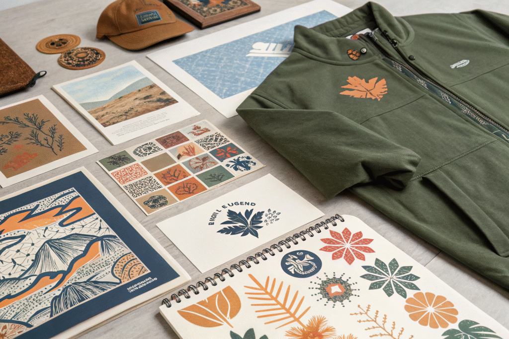 The trend is towards vintage and retro graphics from the 90s and early 2000s, small embroidered logos, abstract prints, and nature-inspired motifs. Colors are shifting to muted earth tones like olive green, ochre, clay, and slate blue, punctuated by occasional bright accent colors like cobalt blue or rust orange for energy.