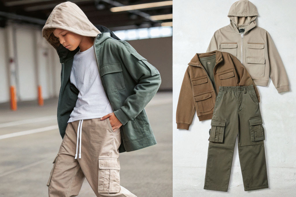 The latest trends in kids boys casual wear focus on sustainable and organic materials, relaxed and utilitarian silhouettes (like cargo pants and oversized fits), nostalgic graphics from 90s/Y2K eras, versatile "play-to-playdate" layering pieces, and earthy, muted color palettes mixed with bold accent colors.