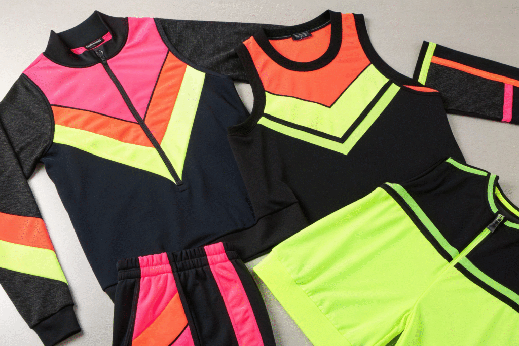 This includes neon brights and fluorescent accents against dark bases, contrasting binding on necklines and armholes, reflective details for safety and style, and asymmetric color blocking. The goal is to create sportswear that looks fast and energetic even when standing still.