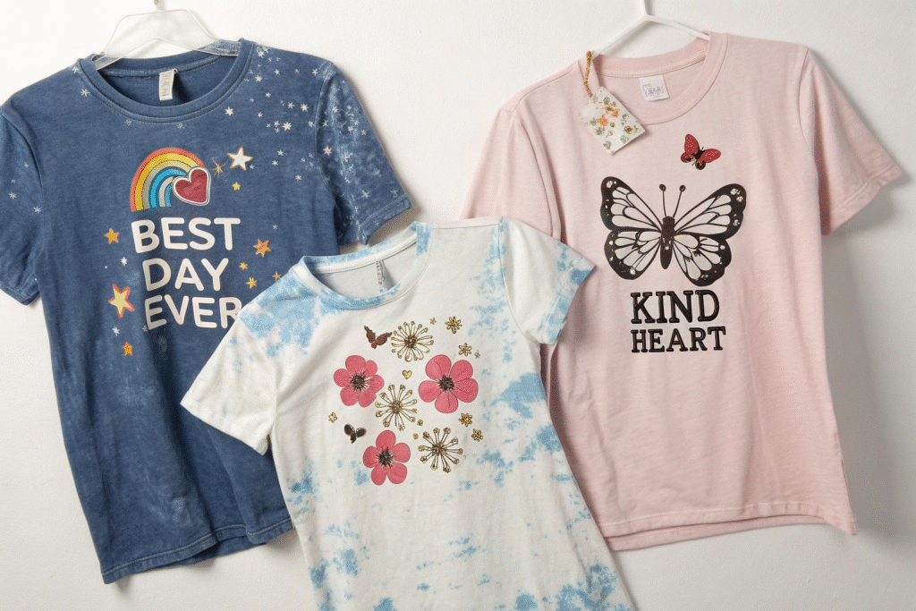 This includes retro cartoon and anime-inspired graphics, sparkly or glittery details, butterfly and celestial motifs, ditsy floral and gingham prints, and playful, positive slogans (e.g., "Best Day Ever," "Kind Heart"). The treatment is often distressed, tie-dye, or heathered for a vintage, lived-in feel. These graphics move away from licensed characters towards more artistic, brand-owned designs that tell a unique story.