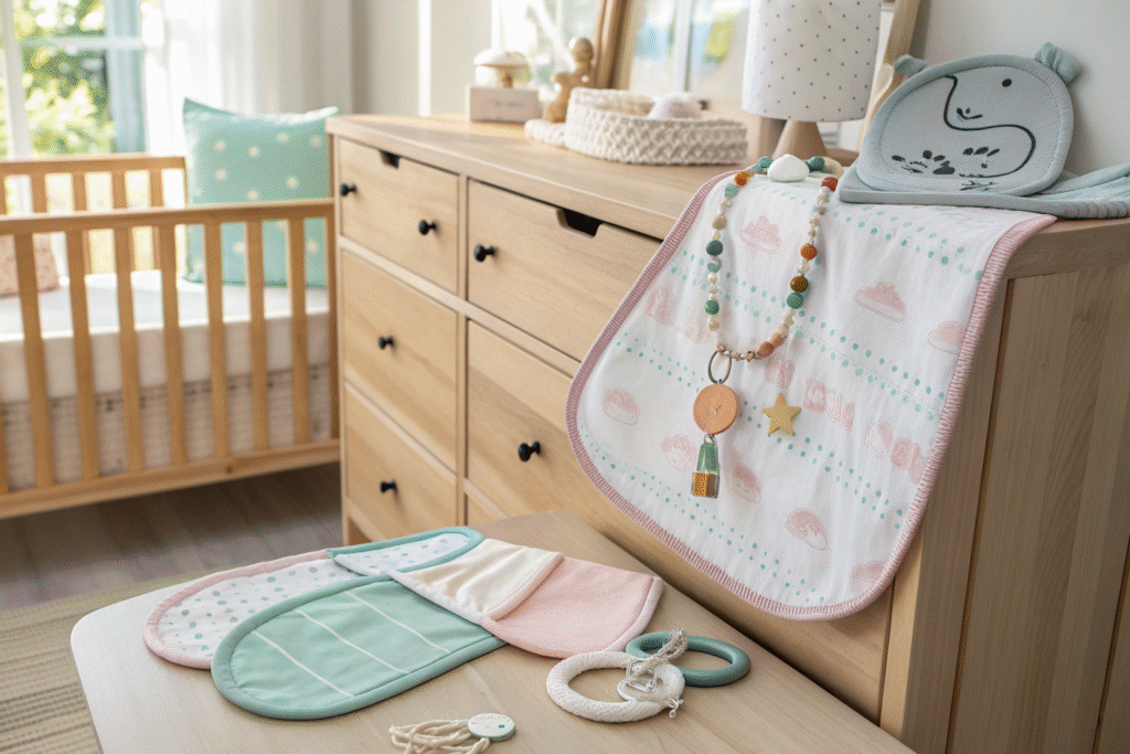 Practical baby accessories now include multi-use bibs, pacifier holders, and swaddles that double as nursing covers.