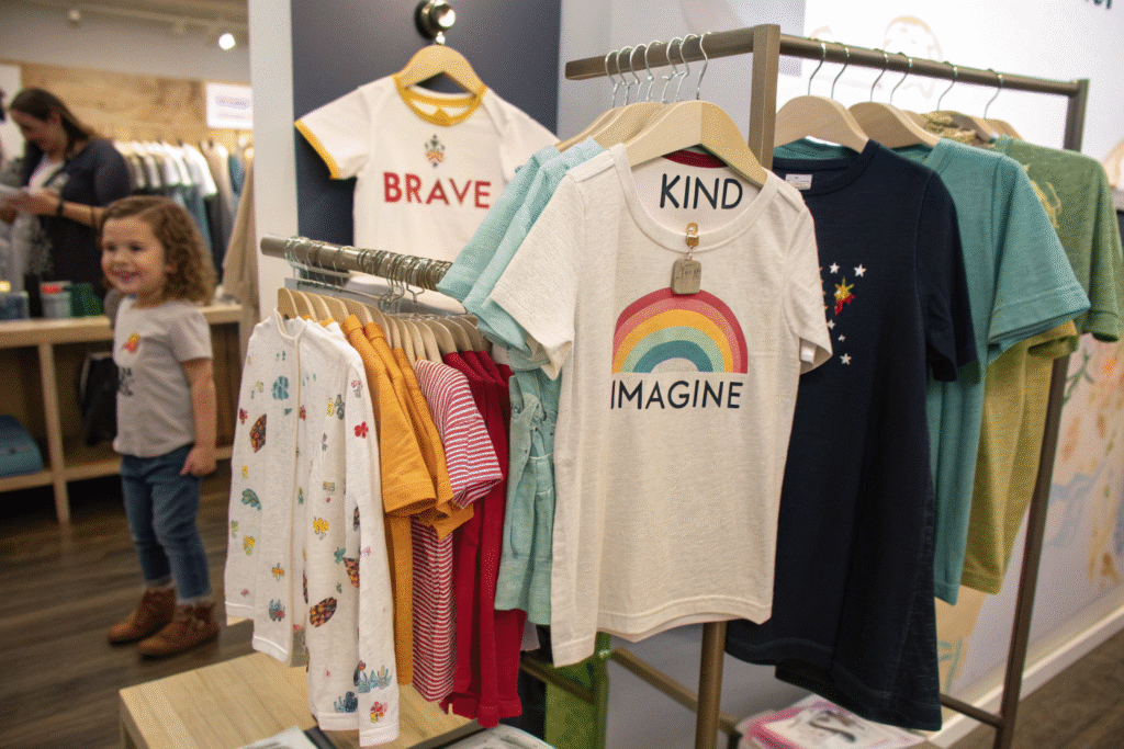 This is achieved through gender-neutral color palettes and styles, prints and messages that promote positivity and resilience (e.g., "Brave," "Kind," "Imagine"), collaborations with child psychologists or artists, and collections that celebrate diverse abilities, body types, and family structures.